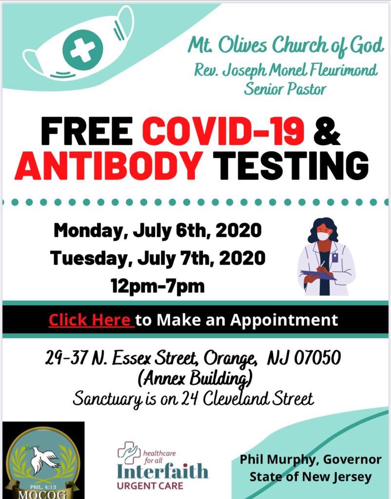 Governor Phil Murphy On Twitter Testing Update Mt Olives Church Of God In Orange Will Have Free Covid19 And Antibody Testing On July 6th And 7th From 12 00 Pm 7 00 Pm