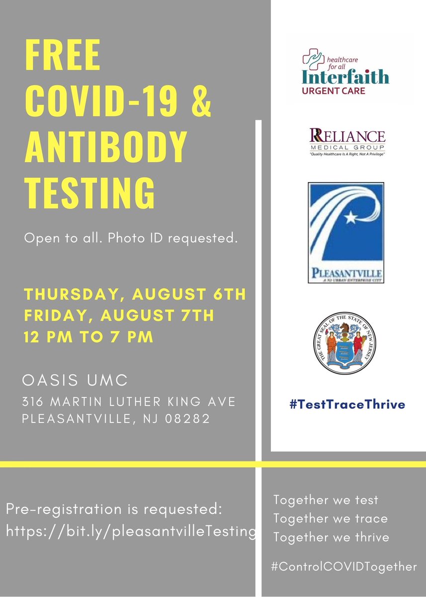 New Jersey On Twitter Free Covid19 And Antibody Testing In Pleasantville Open To All August 6 7 2020 12 00 Pm 7 00 Pm Oasis Umc 516 Martin Luther King Ave Pleasantville Nj 08282
